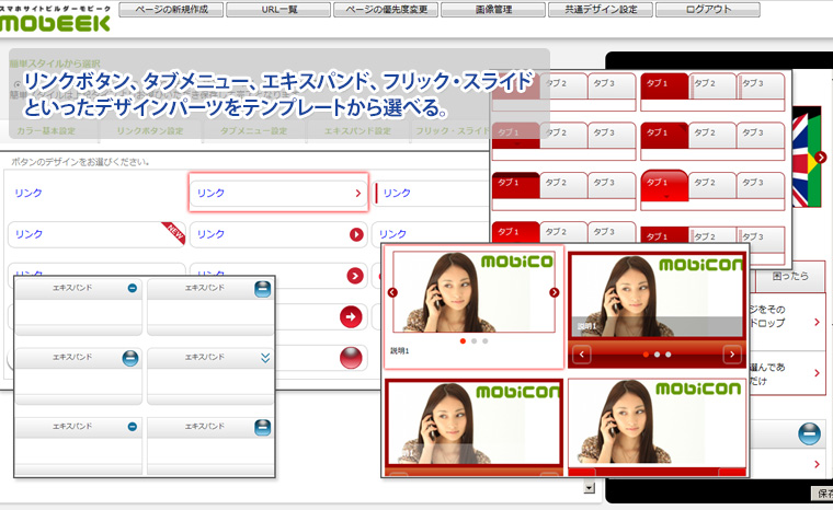 基本となる作業は、「テンプレートによるデザイン設定」「ベースとなるPCサイトの登録」「デザイン部品の選択」「ドラッグ&ドロップによる直感的な操作」の、たったこれだけ!